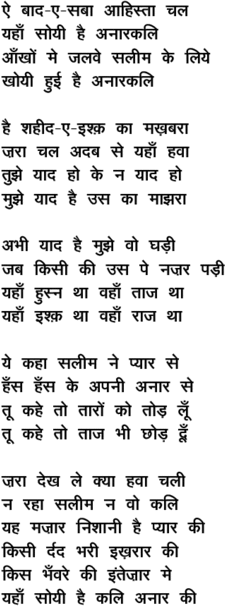 % Transliterator: Prithviraj Dasgupta % Availablity: HMV CD Anarkali/Nagin sdtrk, Anarkali DVD % Date: April 12, 2002 % Comment: Hemant mentions in his autobiography % "Anand dhara" that Anarkali's producer S. Mukherji % wanted the original title music composed by C Ramchandra % to be replaced by a song. Since CR was not available % at that time, Hemant borrowed this tune, a Heer, % from a Bengali number sung by him in 1950 and MD-ed by % Anupam Ghatak, titled "shukno shakhar pata jhore % jaay". Based on posts in RMIM archives, Hemant % apparently mentioned this fact to author Harish % Bhimani too. CR is credited for this song % in all audio media (gramophone record/CS/CD).