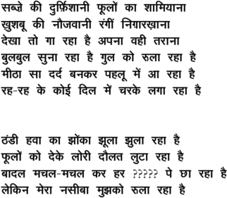 % Dhananjay Naniwadekar (last 3 of 6 minutes) % Date: Dec 7, 2002 % Credits: Afzal Khan, Satish Kalra % Comments: Shinde also composed under the pseudonym % Hemant Kedar. This was his only song in 'Bihari'. % Other songs in Bihari were composed by % Naresh Bhattacharya. % sabza = dew, durfishaanii = eloquence, (dur = pearl) % niGaarakhaanaa - allegorical reference to this world % 'charake lagaanaa' = zakhm denaa. % generated using giitaayan